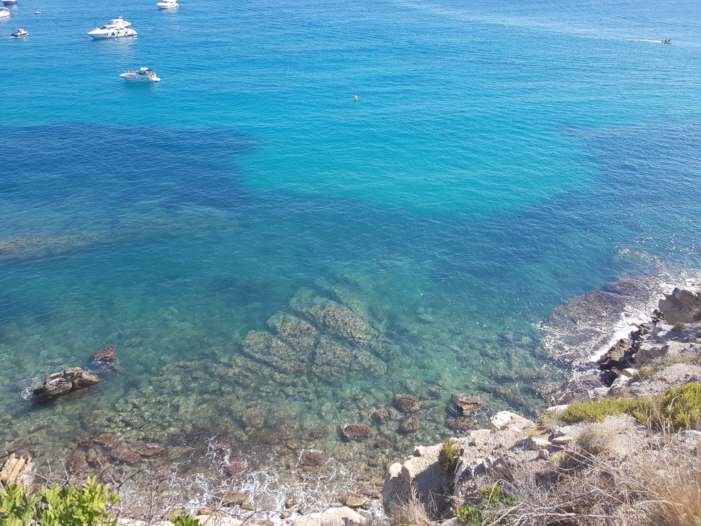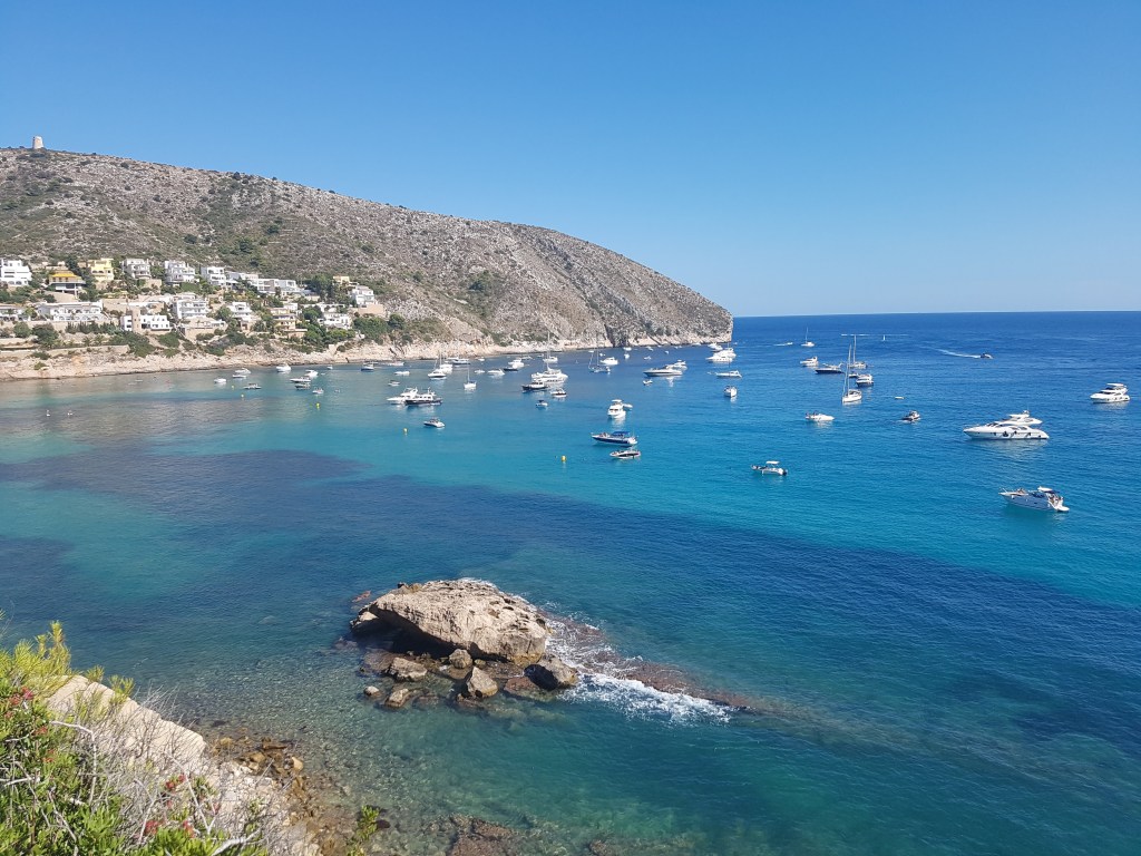 A beautiful day in August I went for a drive (I like driving – especially when it takes me to new places) 🚗 The plan was just a little drive and a walk in Calpe, Alicante. I drove down to Calpe and found a road leading along the coast – this is where that feeling of “I just have to check out where this road leads…“. So off I went. I arrived in a town called Moraira. I parked the car and started walking along the coastal path, where the water had this beautiful blue color that just mesmerises you.
