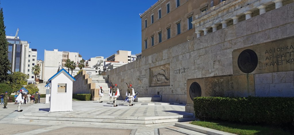 Syntagma Square is the heart of Athens, home to the Greek Parliament and the Tomb of the Unknown Soldier, a monument honoring fallen Greek soldiers. Pass by on Sundays at 11:00 to witness traditionally dressed soldiers perform a synchronised Changing of the Guard ceremony π¬π·